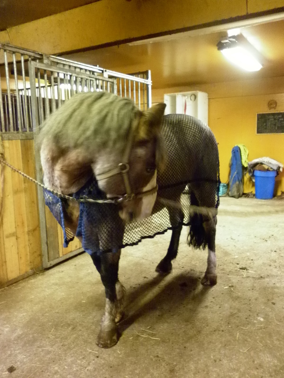 Kyljistä edelleen tuntui olevan vähän arka, häntä viuhtoi välillä, kun harjailin. Mut sekin unohtui kun maha oli täynnä puuroa. Laitoin satulankin tänään, jos vaikka olisi kuinka pörheää pimeällä. Lisäksi virittelin kasan heijastimia ihan jo siltäkin varalta jos Taavi vaikka pääsisi irti.